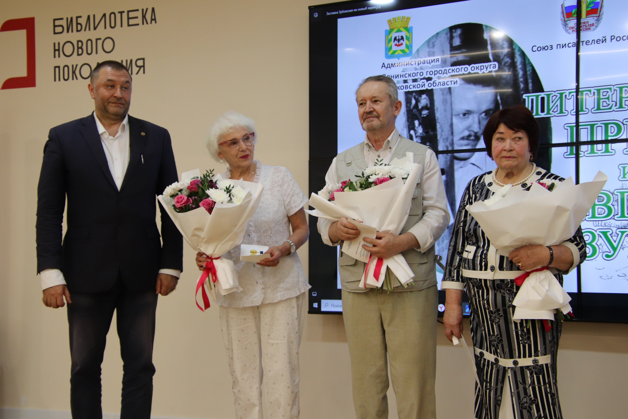 Торжественную церемонию награждения Всероссийской премией поэта-земляка Евгения Зубова провели заместитель главы администрации Ленинского городского округа Татьяна КВАСНИКОВА, секретарь Союза писателей России Сергей БЕРСЕНЕВ и председатель правления Московской областной организации Союза писателей России Сергей АНТИПОВ.