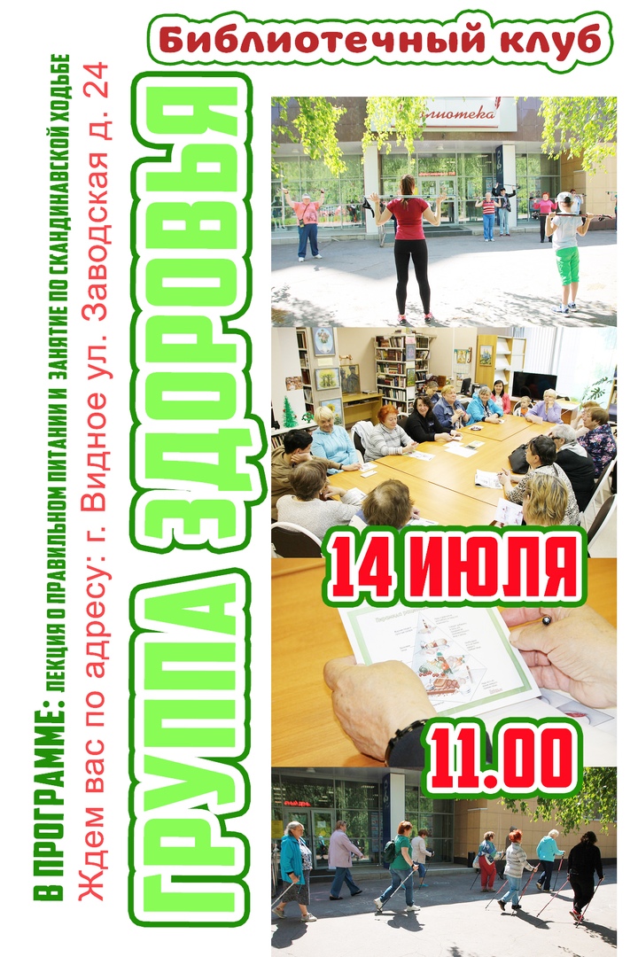 От вас требуется только позитивный настрой и спортивная обувь. Ждем вас по адресу: г. Видное, ул. Заводская д. 24 ВНИМАНИЕ! Если вы хотите принять участие в тренировке по скандинавской ходьбе и не имеете при себе палок, необходимо предварительно записаться по телефону 8(495) 541-44-11. Библиотека - это не только новые знания, творчество и отдых, но ещё и здоровье!
